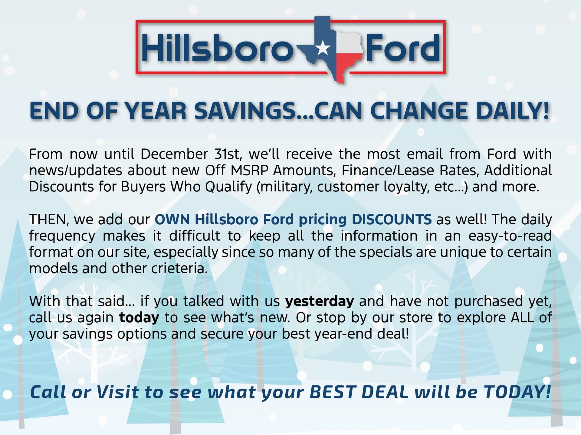 Hillsboro Ford has been in operation since the 1930s. Visit us today and find out for yourself why our reputation has stood the test of time. Our expert sales, service and parts personnel are standing by and waiting to assist you. Drive the short country mile down the road to Hillsboro Ford today. Find out for yourself why our neighbors in Waco, Waxahachie, Whitney, Cleburne and Midlothian have been shopping with us for years. Your New 2024 Ford Edge SEL is waiting for you.